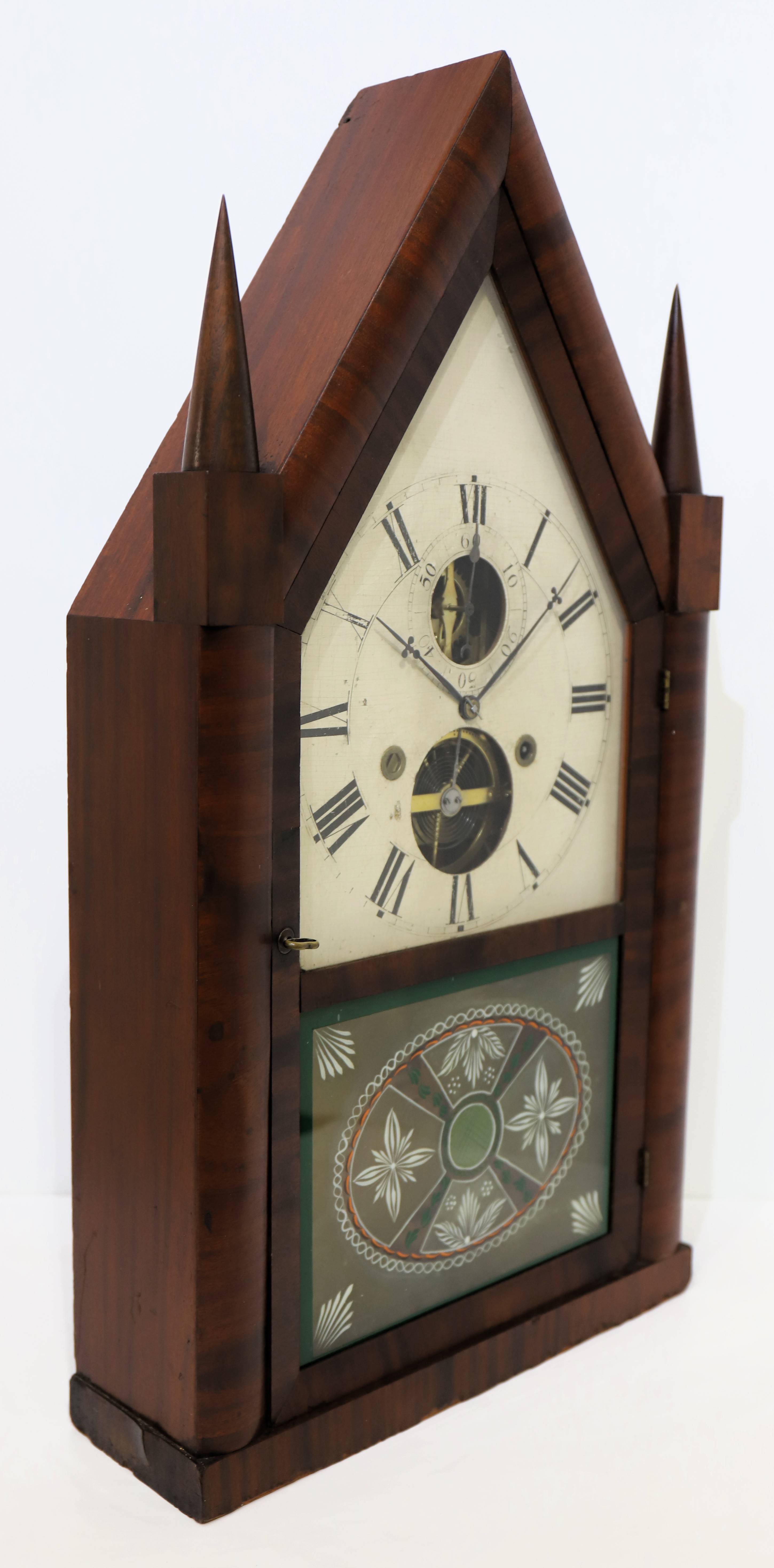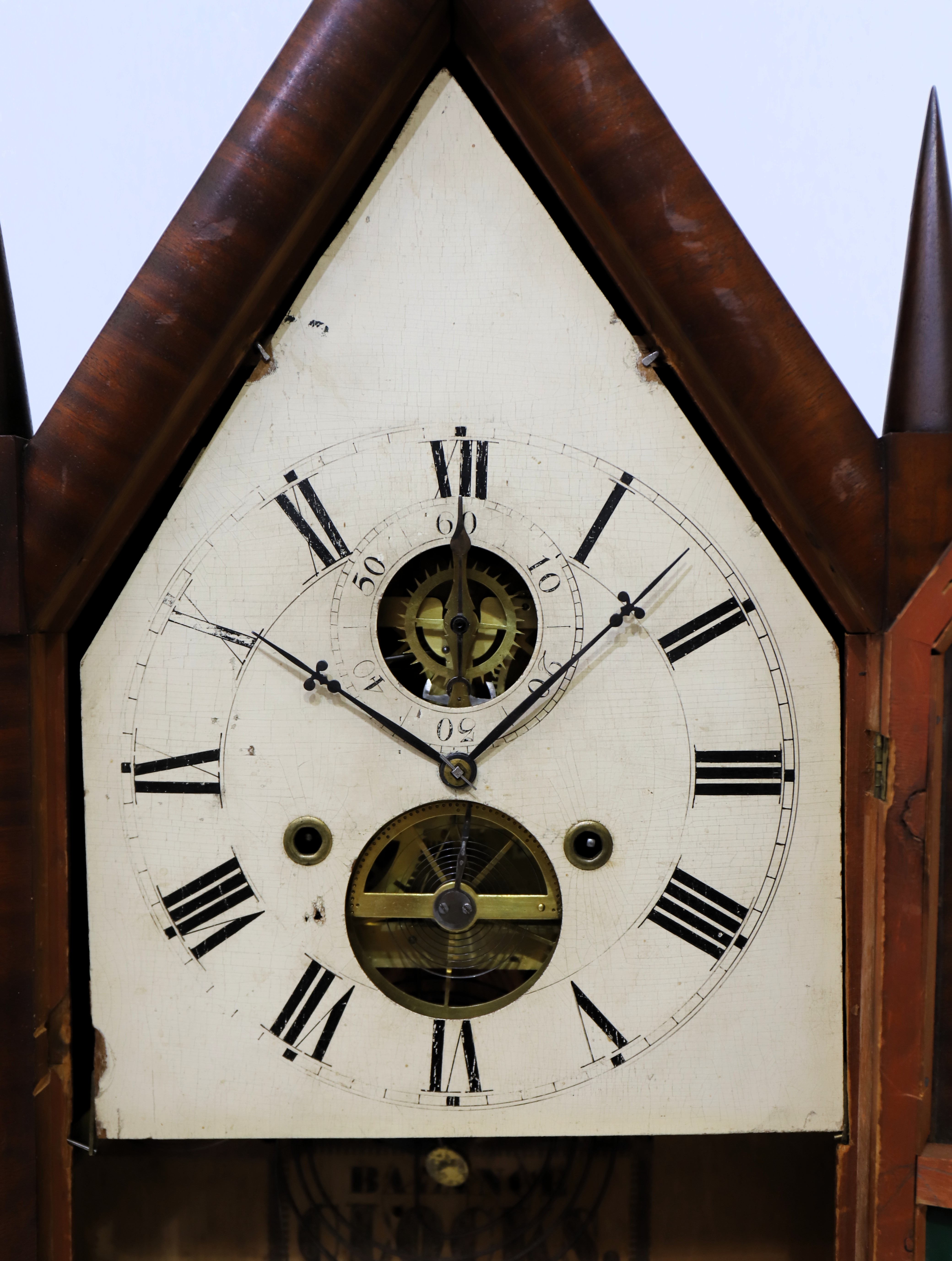 used in this clock around 1850. The oversized steeple case (24.5 inches tall, 13.25 inches wide) is veneered in mahogany with