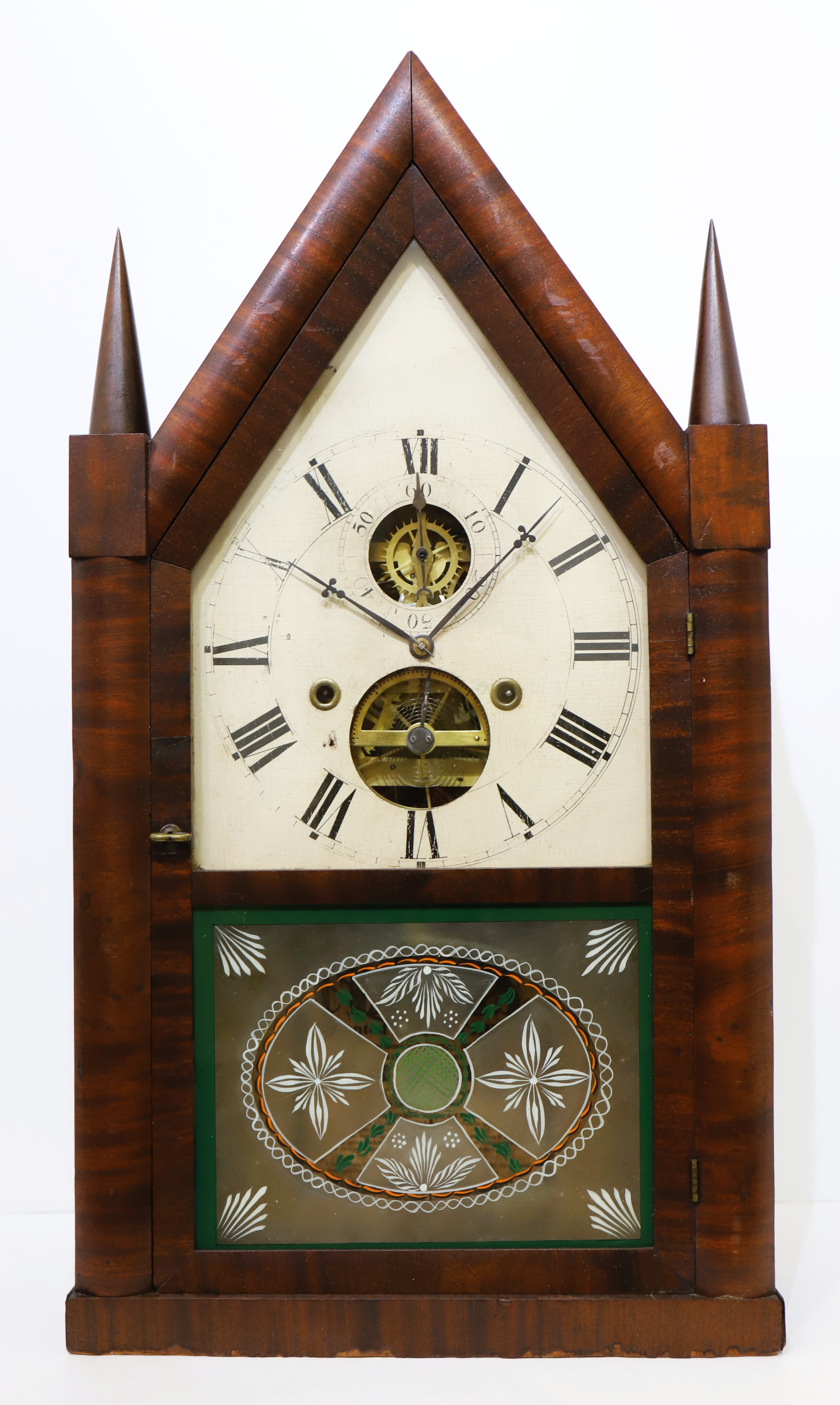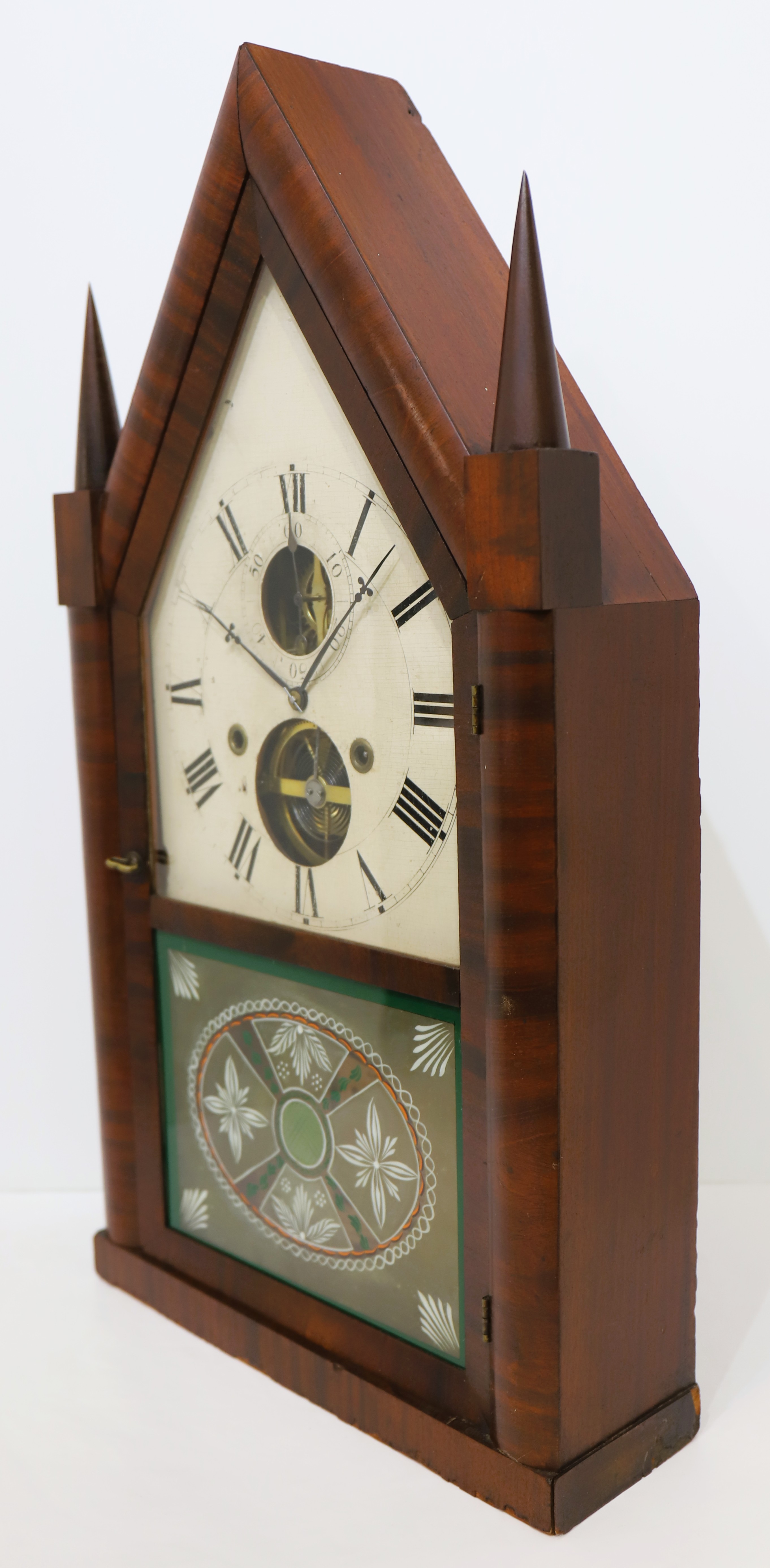 used in this clock around 1850. The oversized steeple case (24.5 inches tall, 13.25 inches wide) is veneered in mahogany with